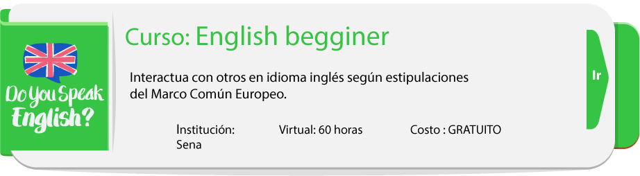 | ENGLISH DOT WORKS 1 | BILINGUISMO | 60 horas | Gratuito | 30/10/2019 | http://oferta.senasofiaplus.edu.co/sofia-oferta/detalle-oferta.html?fm=0&fc=M_kDkBIpuJM | |